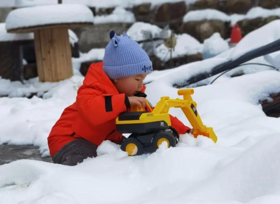 回老家过年,清晨推开大门,多年未见的雪景映入眼帘,站在门前方能体会“开门枝鸟散,一絮堕纷纷”的意境。弟弟年幼不知雪寒,一屁股坐在雪地里撒欢,小脸冻得红扑扑惹人怜。