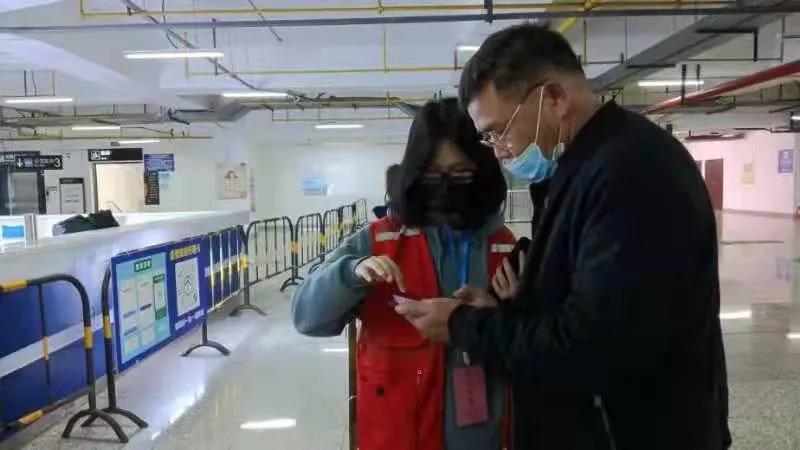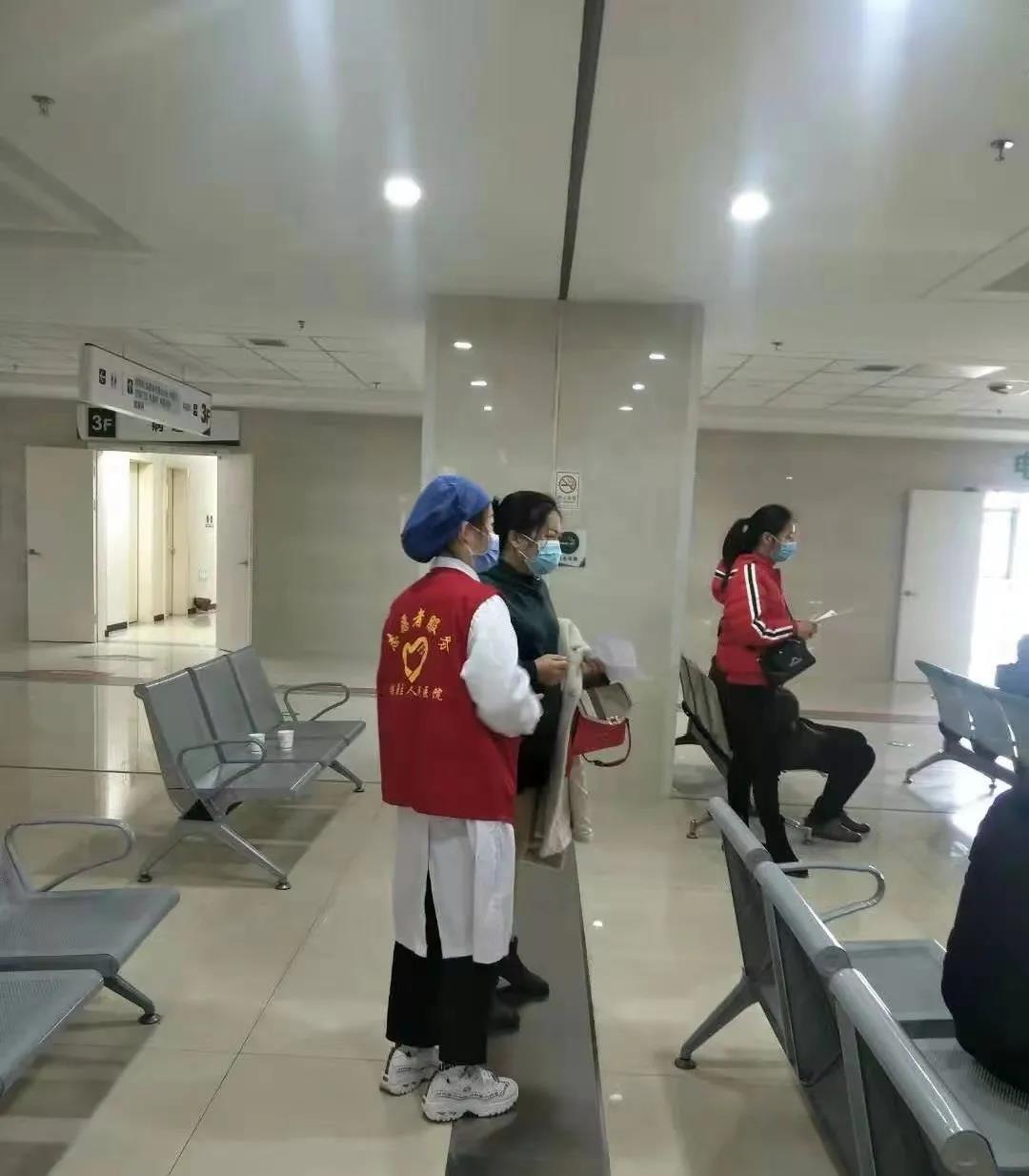 图片中我为前来问诊的病人提供就医咨询,告诉他们该去哪挂号缴费,以及在哪等待叫号就医。我不仅要指引病人还要负责叫号,显示器排到哪位我就负责指引对应的病号前往指定的窗口进行问诊。其次,我负责在工作的科室区域督促病人有序按照间隔就坐,保持安全距离,戴好口罩。