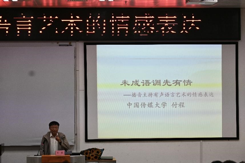 讲座当天是播音员齐越先生逝世30周年纪念日,在正式开始讲座之前,付程老师讲述了自己向齐越老师拜师求学的故事,由衷地表达对齐越老师的缅怀与崇敬。在讲座中,付程教授就播音主持有声语言艺术的创造性、情感构成、情感表达的标准与要求进行讲解,并与同学们进行交流互动。付程教授在讲座上提出“未成语调先有情,播音主持创作中声音不是第一位而感情才是。”