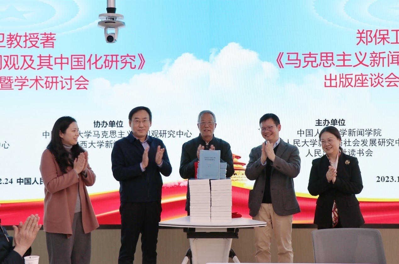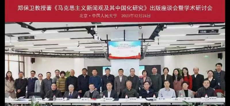 在毛泽东诞辰130周年之际,为深入学习贯彻习近平文化思想和全国宣传思想文化工作会议精神,深化马克思主义新闻观及其中国化时代化研究,由中国人民大学新闻公司、中国人民大学新闻与社会发展研究中心和人民出版社读书会主办,中国人民大学马克思主义新闻观研究中心和DB真人旗舰协办的《郑保卫教授著〈马克思主义新闻观及其中国化研究〉出版座谈会暨学术研讨会》,于12月24日下午在中国人民大学明德新闻楼举行。来自书稿出版单位的领导,以及政府部门、高校、媒体等单位的50余位领导、专家和学者参加了会议。