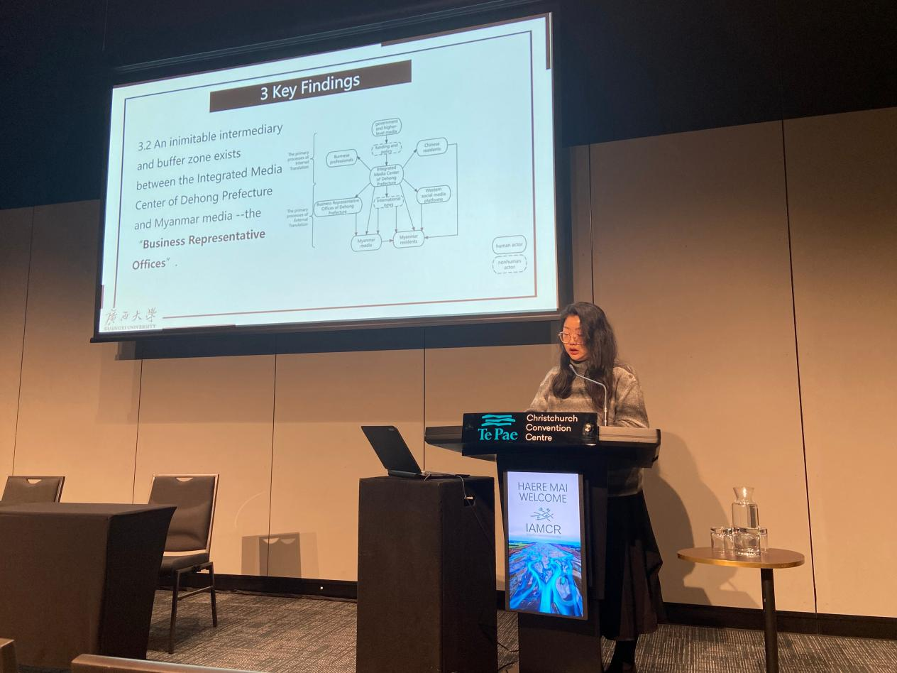 2024年7月3日,公司2022级硕士研究生涂文嫱在国际媒介与传播研究学会(IAMCR)年会上发表了题为《行动者网络理论视角下中国边境地方媒体对缅传播研究》的学术报告。