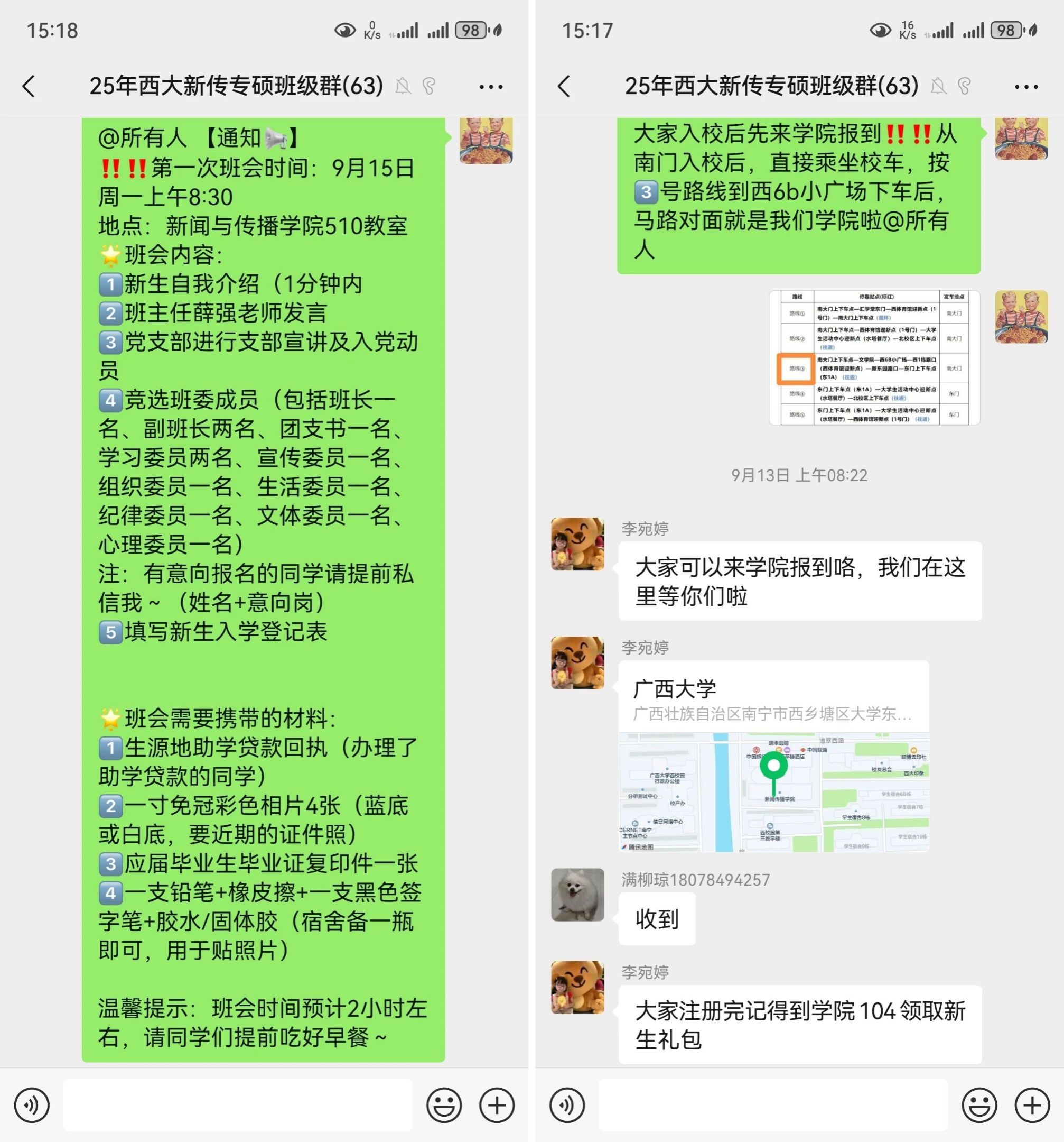新生入学前,研究生志愿者便与新生建立密切联系,通过班级群聊、私聊等方式开展入学服务。一方面,细致讲解报到全流程,逐条梳理入学材料清单,确保新生提前做好准备;另一方面,聚焦校内外防诈宣传,结合常见风险场景提醒新生 ,报到期间切勿在未知情况下外借身份证,警惕陌生电话卡办理、虚假缴费等诈骗行为,为新生筑牢入学安全屏障。