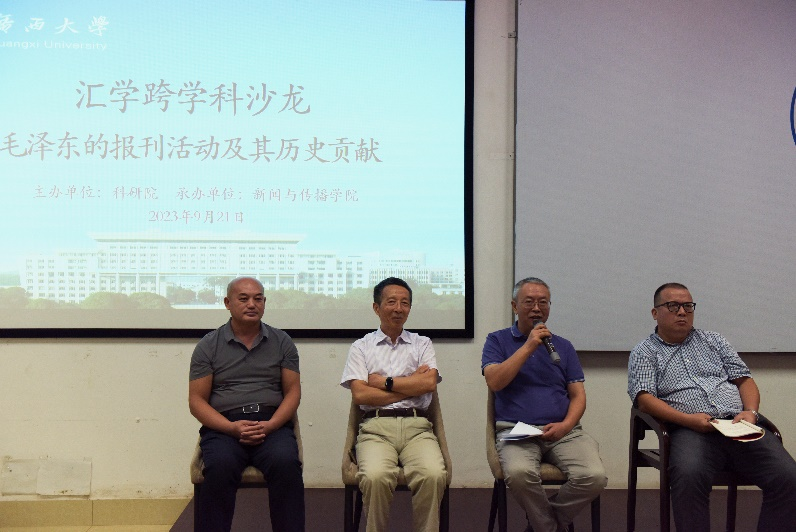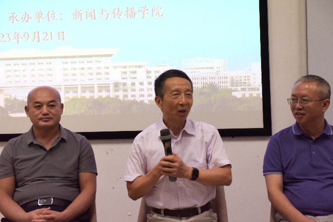 随后,外国语公司严辰松教授讲话。他说道,通过参与这次沙龙活动,他对毛泽东的新闻思想有了新的认识,也了解到毛泽东同志办报活动对于中国新闻事业的作用。