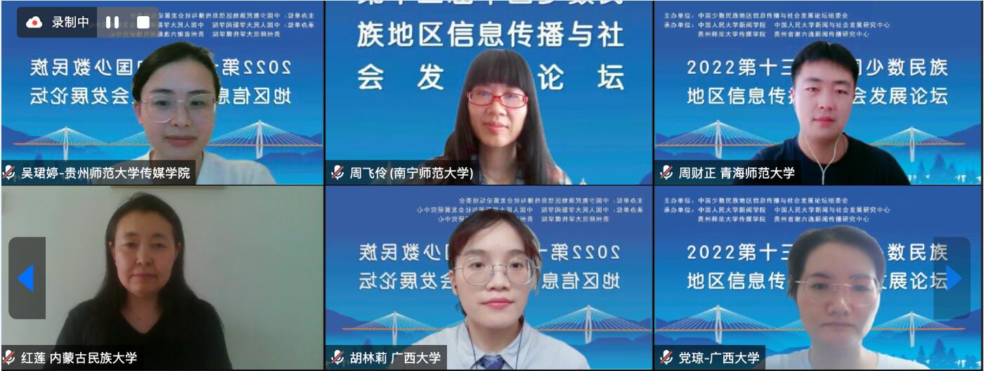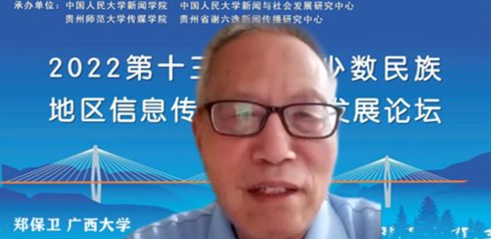 7月22日,第十三届中国少数民族地区信息传播与社会发展论坛以线上会议方式在贵州师范大学传媒公司举行。DB真人旗舰集团特聘君武荣誉教授、中国少数民族地区信息传播与社会发展论坛荣誉理事长郑保卫,党琼助理教授以及硕士研究生胡林莉、王子璇参加了论坛并作学术发言。