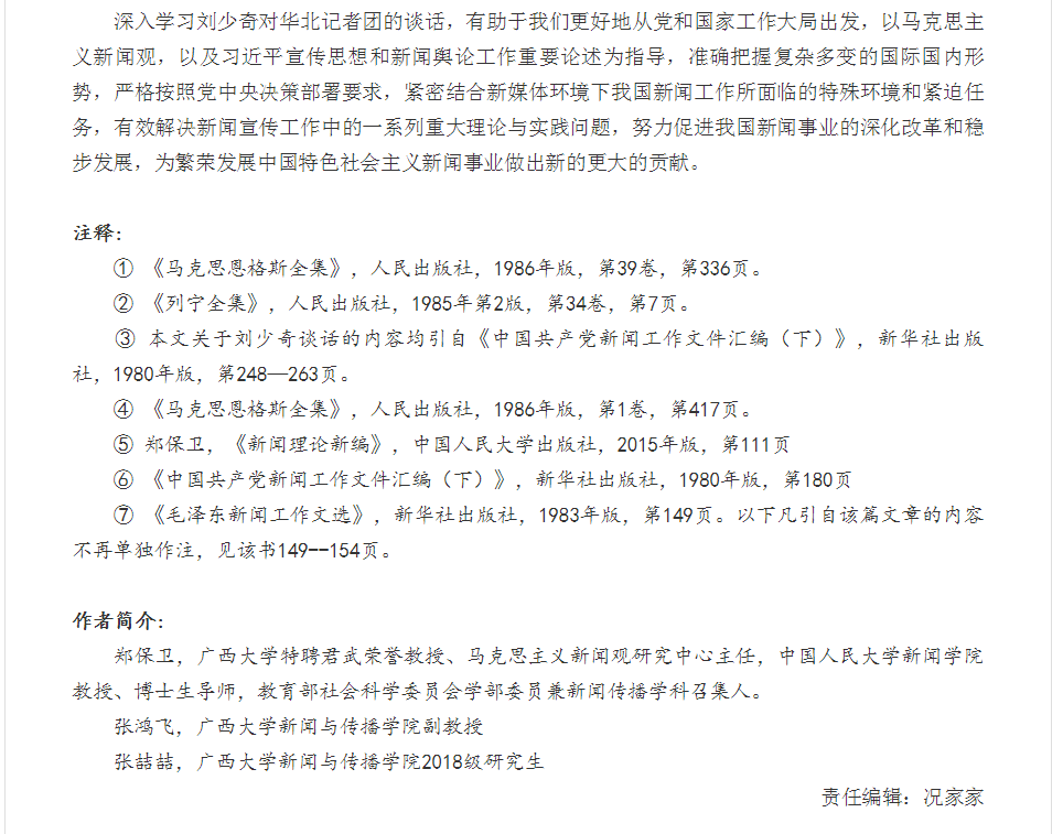 郑保卫经理、张鸿飞副教授发表《刘少奇对华北记者团讲话的时代背景、理论内涵及历史意义》文章,中国理论网全文刊载