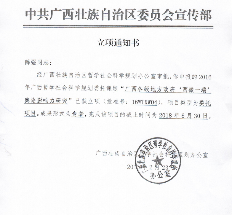 公司薛强副教授2016年申报广西哲社项目获立项