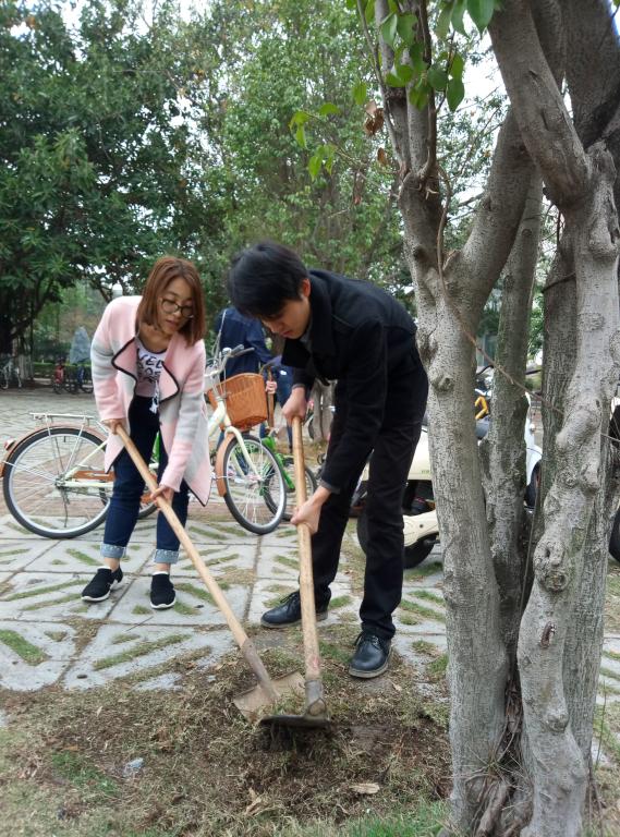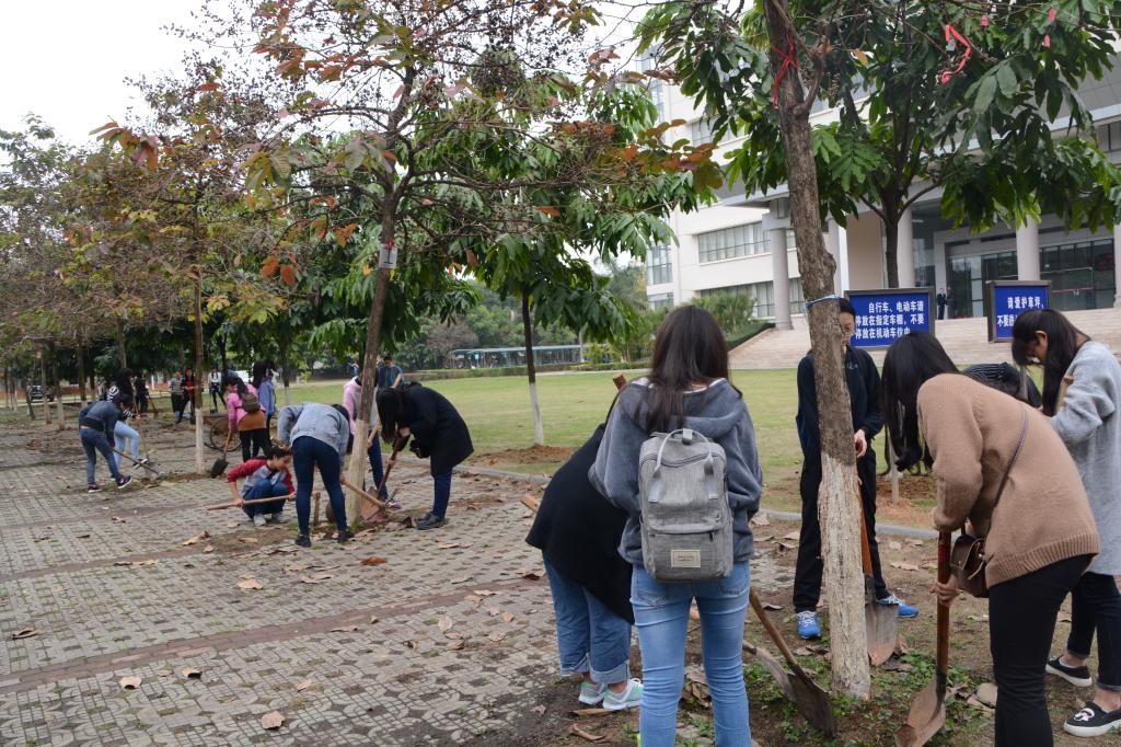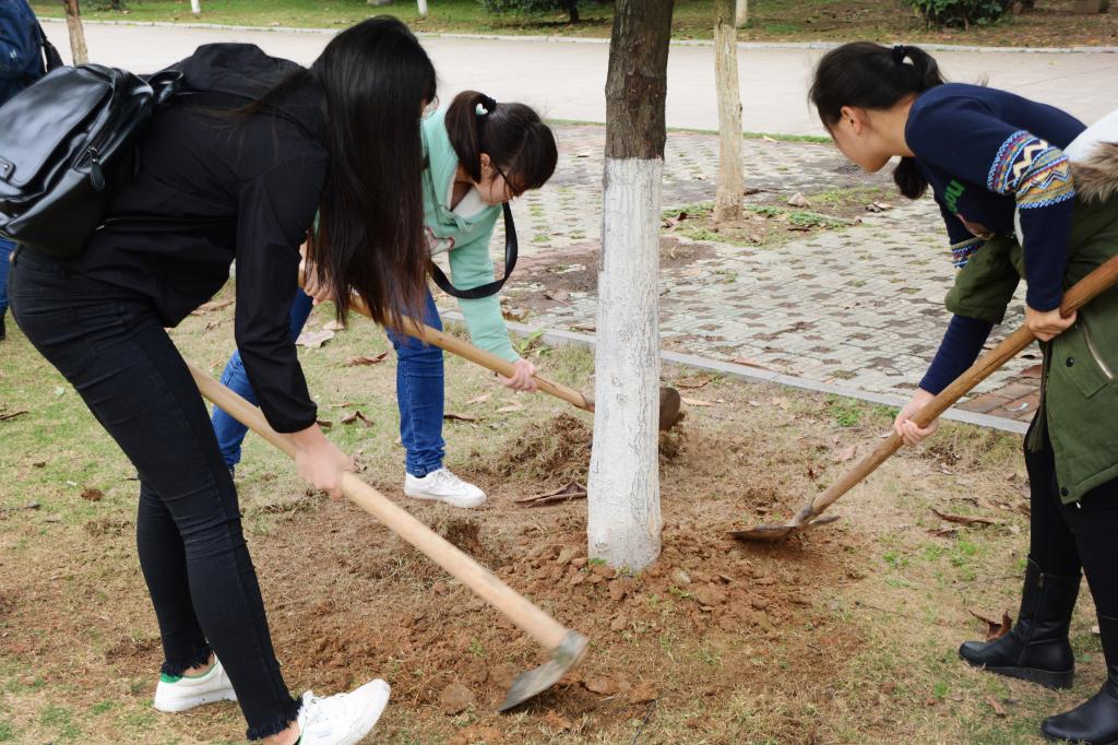 活动过程中,每三名同学为一组,各自认领两棵小树,为它锄草松土。因为大多数同学此前从没接触过树木养护工作,所以在使用锄头、铲子等工具时动作生涩,略显吃力,但同学们认真的劲头使得养护工作进展顺利。经过两个小时的努力,同学们完成了几十颗小树的养护工作。
