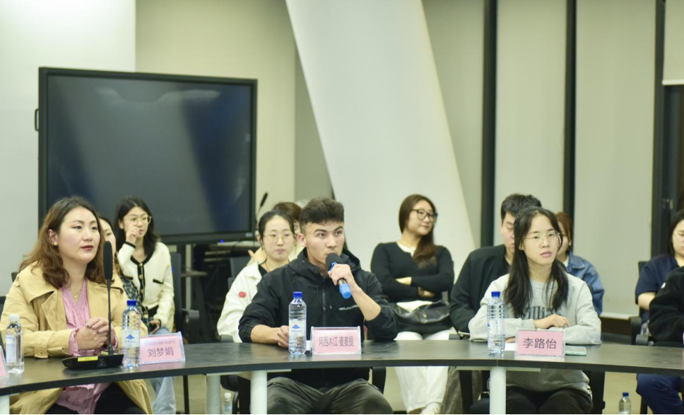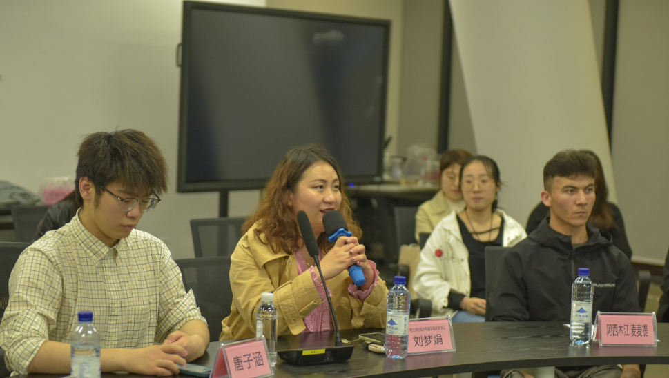 新闻211班阿西木江·麦麦提(左二)发言