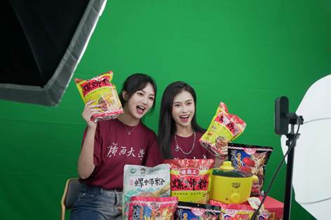 同学们在现场与企业直播团队合作拍摄了螺蛳粉直播抖音视频,将自己所学运用到了本次实践调研活动当中。“这次柳州之行真是不虚此行!我们不仅吃到了酸辣鲜香烫的柳州螺蛳粉,还实地体验了直播带货。”此次行程让播音与主持艺术专业黄悦华同学十分惊喜,现场体验直播带货后,她为能充分发挥自己的专业优势感到开心,但在感到新奇的同时,她也感慨到,主播是一份既需要脑力也需要体力的工作,像如何用有趣的话语吸引消费者,如何更好地宣传产品卖点,都需要进一步学习研究。