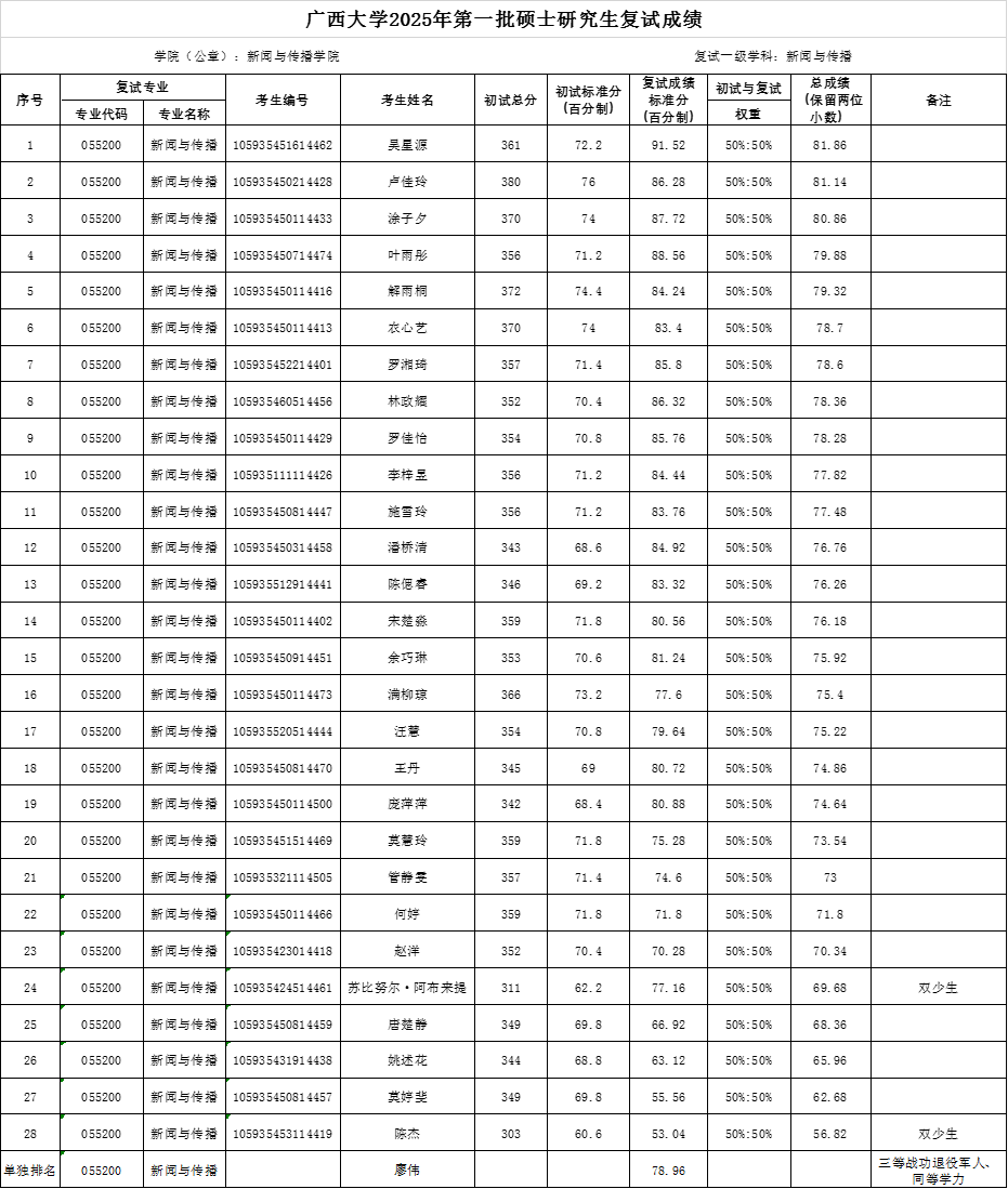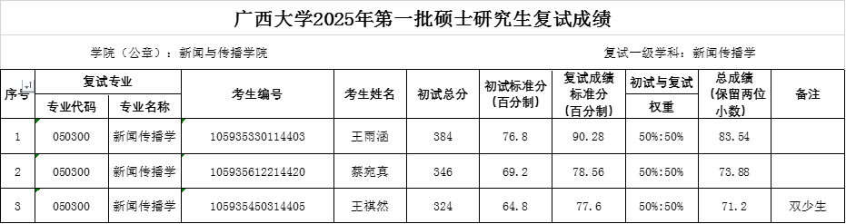 DB真人旗舰2025年新闻传播学、新闻与传播一志愿考生复试成绩如下,如有异议,请联系DB真人旗舰研究生办公室反映,联系电话:0771-3229833。