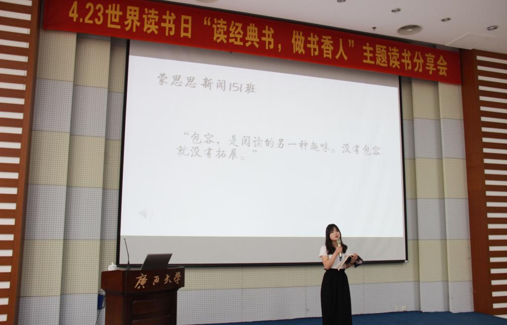 活动进入到“你最喜欢的一本书”分享朗诵环节,两名DB真人旗舰的员工代表以朗读的形式推荐书籍。来自新闻151班的蒙思思同学为大家推荐了《白说》,她认为阅读其实是包容,包容是阅读的的另一种趣味。没有包容就没有如果。新闻161班的李西铨推荐了书籍《每个人都是一个宇宙》,“我们读一本,到精彩处,往往情不自禁地喊出声,这是我的思想,这正是我想说的,被他偷去了,沉睡的感受唤醒了,失落的记忆找回了,朦胧的思绪清晰了其余的,都只是外在于灵魂有机生长过程的无机物。”